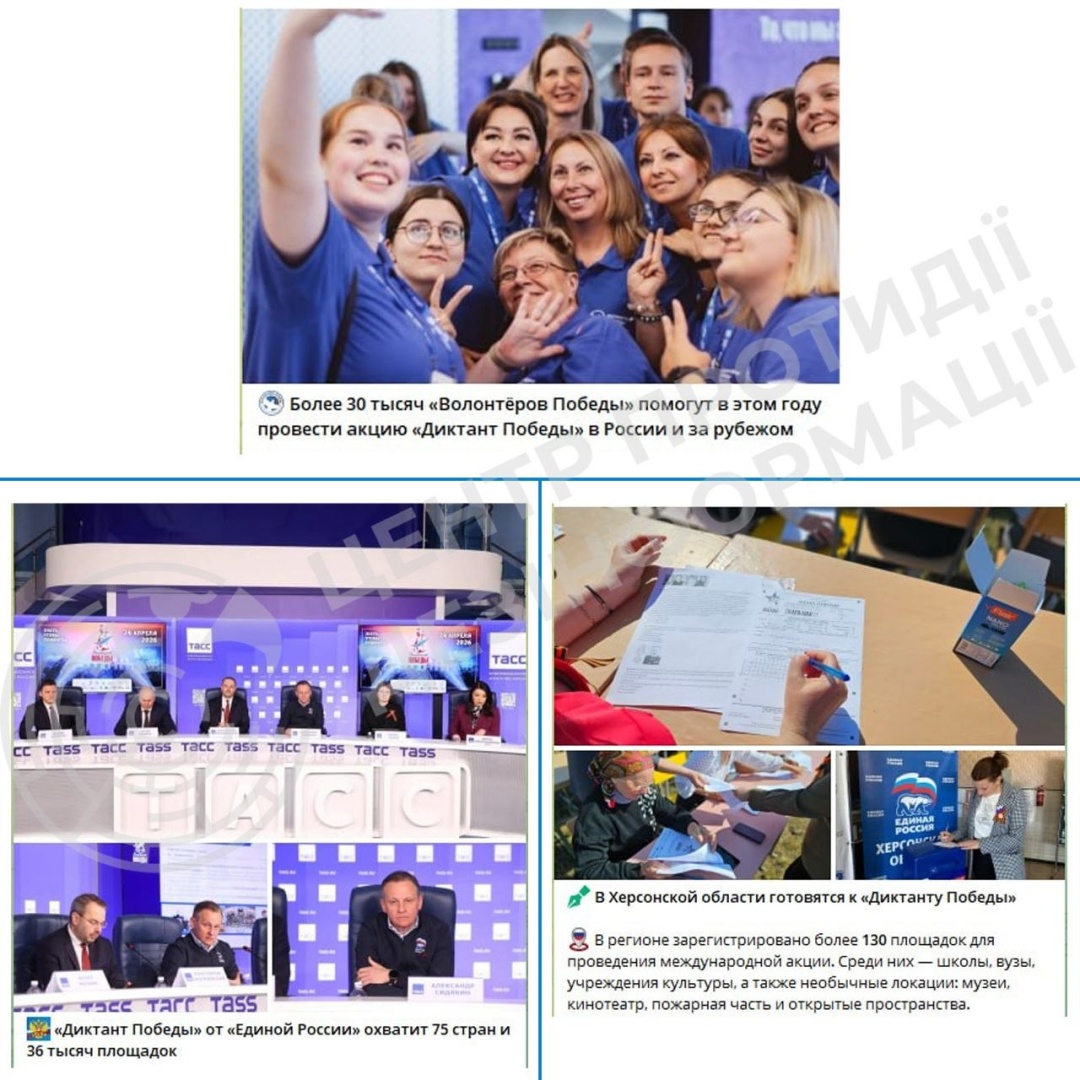 Як зазначають у Центрі, однією з наймасштабніших пропагандистських акцій «побєдобєсія» став «диктант побєди». Медіа РФ хизуються, що цьогоріч диктант стане «рекордним» та охопить не лише навчальні заклади, а «буквально все» - підприємства, установи, вокзали, аеропорти та космодроми.