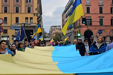 Українська громада міста Болонья (Італія) провела акцію солідарності, щоб нагадати світовій спільноті, що повномасштабна війна Росії проти України продовжує нести щоденну загрозу, вбивства та знищення.