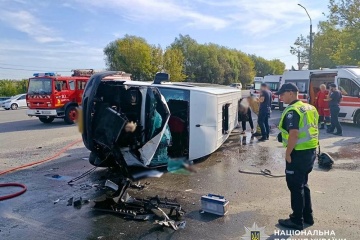 У Звягелі Житомирської області внаслідок ДТП за участі рейсового мікроавтобуса та кросовера один пасажир загинув, четверо потрапили в реанімацію, а двадцяти трьом, серед яких троє дітей, надали медичну допомогу.