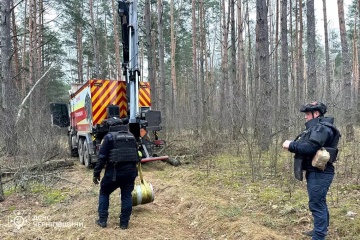 Сапери Державної служби України з надзвичайних ситуацій виявили і знищили на Чернігівщині бойову частину снаряда російської реактивної системи залпового вогню «Ураган».