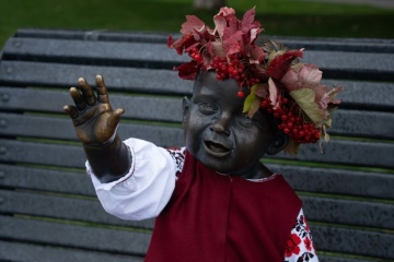 У столиці на Поштовій площі скульптури малюків-засновників Києва - Кия, Щека, Хорива та їхньої сестри Либідь - переодягли з нагоди Дня захисників і захисниць України, Покрови Пресвятої Богородиці і Дня козацтва.