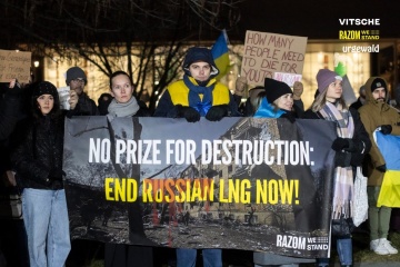 Кілька сотень українців та їхніх прихильників вийшли на акцію протесту в центрі Берліна (Німеччина), закликаючи європейські країни посилити тиск на Росію та повністю відмовитися від купівлі російських енергоносіїв.