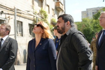 Делегація Латвійської Республіки на чолі з прем’єр-міністеркою Евікою Сілінею оглянули будинок, що зазнав руйнувань під час однієї з наймаштабніших російських атак на Київ.