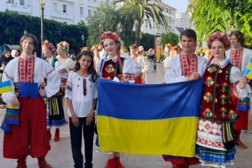 Представники української громади, колектив посольства України й Ансамбль народного художнього колективу сучасної хореографії «Фламінго» Київського палацу дітей та юнацтва взяли участь у святковій ході країн-учасниць Фестивалю «Діти миру» перед парламентом Марокко.