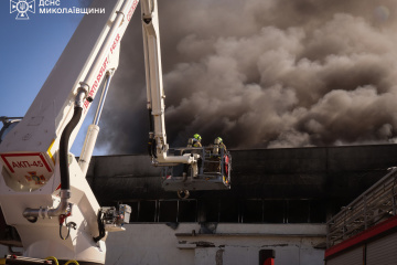 На Миколаївщині рятувальники ліквідували масштабну пожежу на складі сільгосптехніки площею понад 2 тисячі квадратних метрів, яка виникла внаслідок обстрілів.