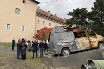 В Ужгородському замку просто неба розмістили машину швидкої допомоги, розстріляну російськими військовими, як свідчення війни.