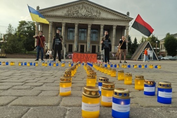У Тернополі відбулася акція-нагадування до третіх роковин теракту в Оленівці. На Театральному майдані у центрі міста створили символічну інсталяцію та запалили свічки у пам'ять закатованих та загиблих у полоні українських захисників.
