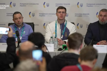Українська громада в Мілані провела мирний флешмоб на підтримку українського спортсмена Владислава Гераскевича, якого дискваліфікували з Олімпійських ігор 2026 через намір виступати в «Шоломі пам'яті».