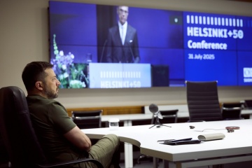 Президент Володимир Зеленський під час онлайн-виступу з нагоди 50-річчя Гельсінського Заключного акту ОБСЄ закликав світову спільноту повністю заблокувати воєнну машину Росії, зокрема, спрямувати всі заморожені активи РФ на захист від російської агресії.